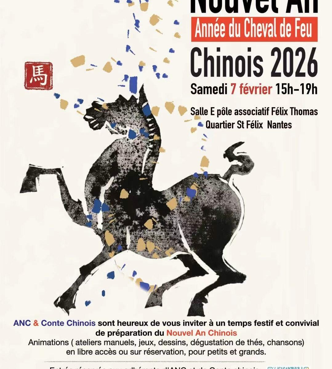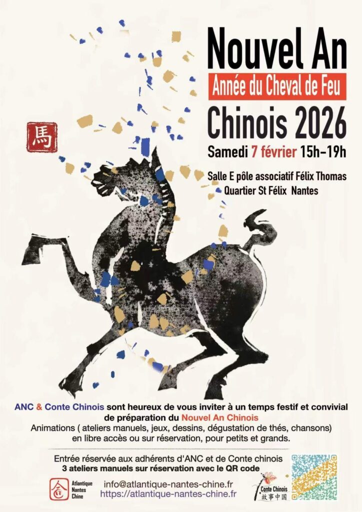 Le samedi 7 février 2026, les associations Atlantique Nantes Chine (ANC) et Conte Chinois invitent leurs membres à un après-midi festif, culturel et convivial autour de la préparation du Nouvel An Chinois – Année du Cheval de Feu.